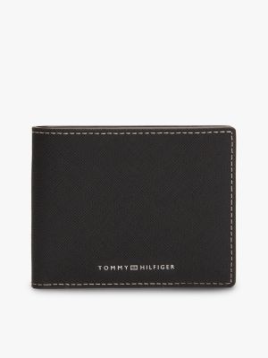 This bifold credit card wallet is crafted from premium saffiano leather, with contrast topstitching around the edge and metallic embossed branding.