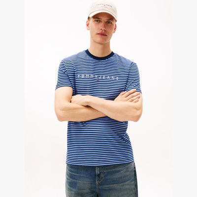 The neckline coordinates with the striped pattern of this pure cotton jersey T-shirt, finished with a minimal linear logo.