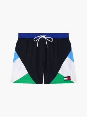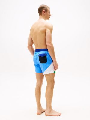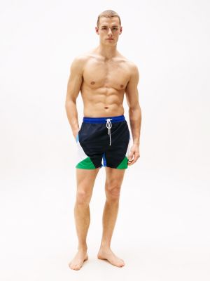 These relaxed swim shorts, featuring a nautical-inspired colour-blocked design and a flexible elasticated drawstring waist, bring a stylish touch to the pool.