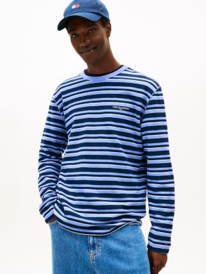 This long-sleeved T-shirt in pure cotton crepe jersey showcases an all-over striped pattern and serif script logo embroidery on the chest.