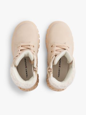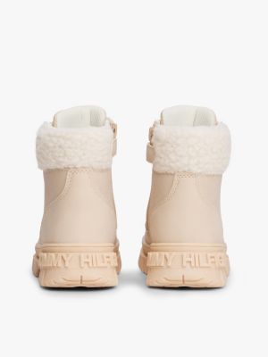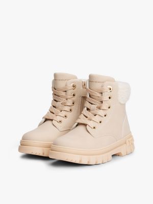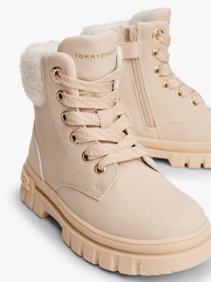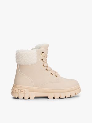 A teddy fleece collar gives these lace-up ankle boots a cosy appeal while their chunky cleated outsole adds a street-ready vibe.