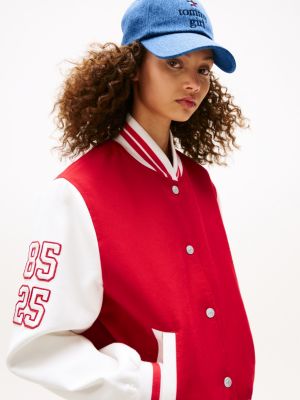 Make a statement with this oversized varsity jacket, where striking logos on the back and sleeves amplify the collegiate-inspired design.