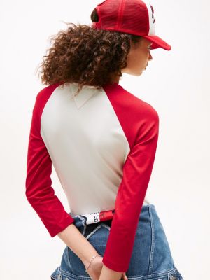 This mini T-shirt dress features archive-inspired heart branding and contrast raglan sleeves, creating a fusion of sweet and sporty energy.