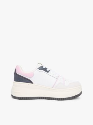 Step out in style with the latest women's trainers from Tommy Hilfiger. Discover sneakers that effortlessly combine off-duty appeal with our iconic signature style. Elevate your casual-chic ensemble by choosing platform women’s trainers, adding a fashionable edge to your outfit. Make a bold statement with the chunky trainer trend, pairing them with a logo t-shirt and high-rise jeans for a fashion-forward look. Seamlessly transition from work to play by incorporating smart heeled women's trainers into your office attire; opt for classic white women’s court trainers with tailored trousers or a midi dress for a polished yet comfortable appearance. For extra warmth, choose stylish insulated sneakers that provide both warmth and fashion flair. When summer arrives, opt for breathable, lightweight sneakers in vibrant colours to keep your style fresh and breezy. Whatever the season, keep your trainers looking spick and span with our video tutorial on how to clean your leather trainers. Embrace the signature East Coast cool and step out in style with Tommy Hilfiger's women's sneakers.